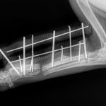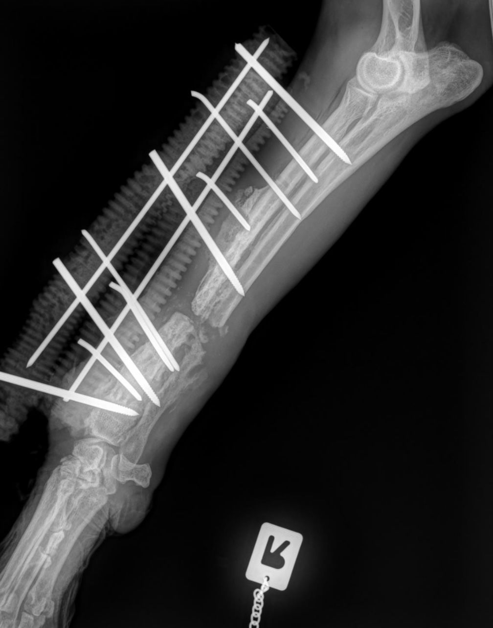 Der Knochen wurde nun auch an den Fixateur-Schrauben nekrös. Eine Kallusbildung am Bruchspalt nicht feststellbar.