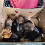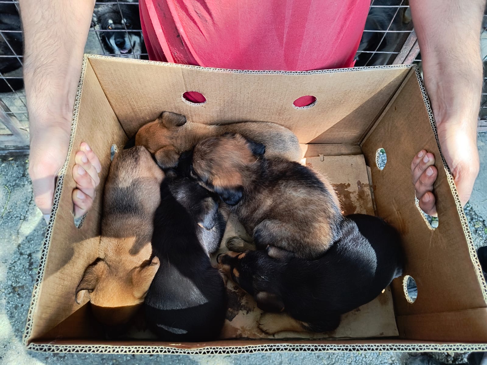 In dem Karton befanden sich 5 völlig verängstigte Welpen. Der Mutter entrissen und nicht wissend, was mit ihnen passiert.